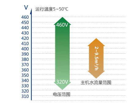 水側(cè)換熱器進(jìn)水范圍:5~50℃,主機(jī)水流量范圍:2~9.5m3/h,滿足全國大部分地區(qū)的地理環(huán)境使用要求;